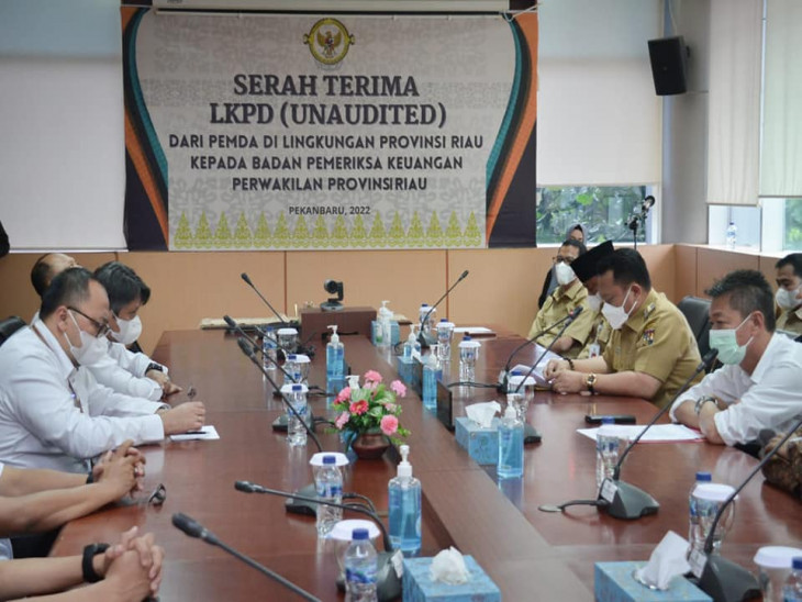 Bupati Kampar H. Catur Sugeng Susanto, SH, MH, menyerahkan Laporan Keuangan Pemerintah Daerah tahun 2021. Laporan tersebut langsung diserahkan kepada Kepala Badan Pemeriksa Keuangan (BPK) Perwakilan Propinsi Riau Agung Firman Saputra di Kantor BPK-RI Pekanbaru, Senin (14/3)