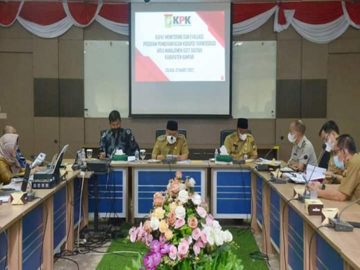 Bangkinang,-Bupati Kampar H. Catur Sugeng Susanto, SH, MH membuka sekaligus mengikuti Rapat Monitoring Dan Evaluasi Program Pemberantasan Korupsi Terintegrasi Area Manajemen Aset Daerah yang ditaja Komisi Pemberantasan Korupsi Republik Indonesia (KPK-RI). Rapat Monitoring yang diselenggarakan KPK-RI tersebut dipusatkan di Ruang Rapat lanti III Kantor Bupati Kampar, pada Selasa (22/3)